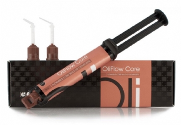 OliFlowCore è un composito microibrido duale ( sia auto che fotopolimerizzante) ad alta fluidità, progettato per ricostruire monconi di denti e anche per la cementazione di perni endocanalari, previa mordenzatura e applicazione di adesivo per compositi.